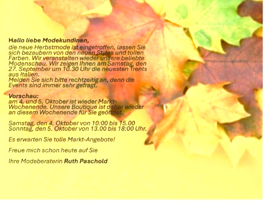 Sie finden uns auch auf diversen Veranstaltungen im näheren Umkreis, oder besuchen Sie doch einmal eine unserer Modenschauen in unserem Landhaus. Die aktuellen Daten erfahren Sie jeweils aus unseren persönlichen Kundenanschreiben, der Homepage oder rufen Sie uns einfach an.
